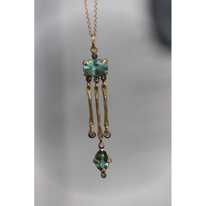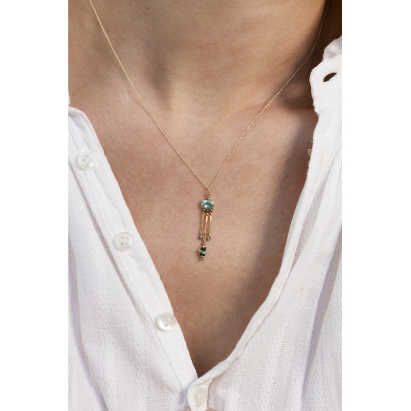 5 Octobre auksinis kaklo papuošalas su apatitais, deimantais ir žaliu turmalinu