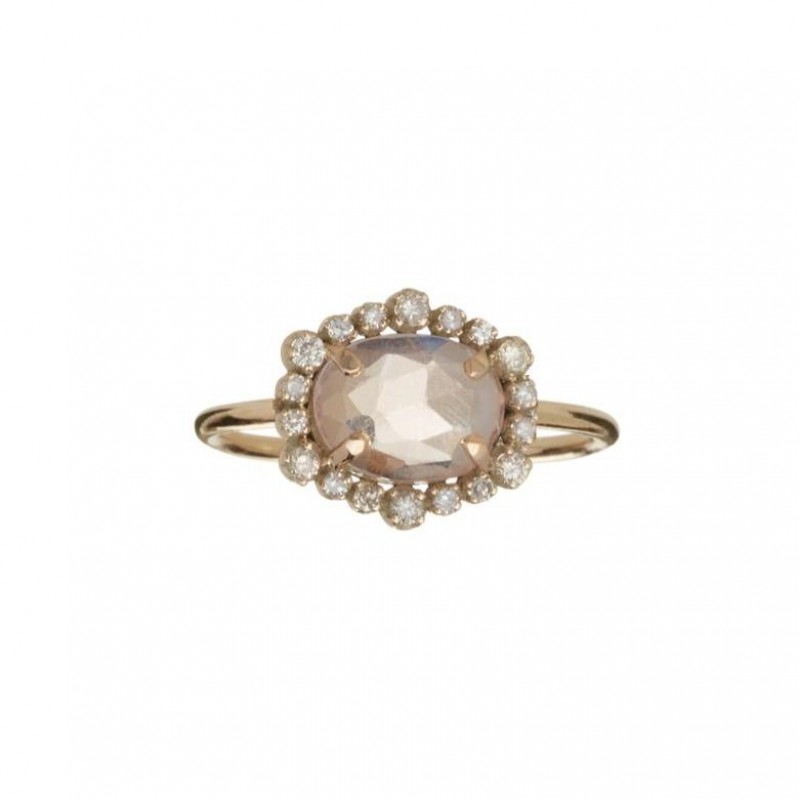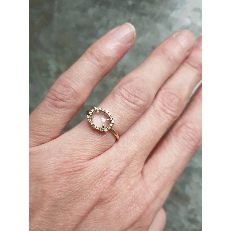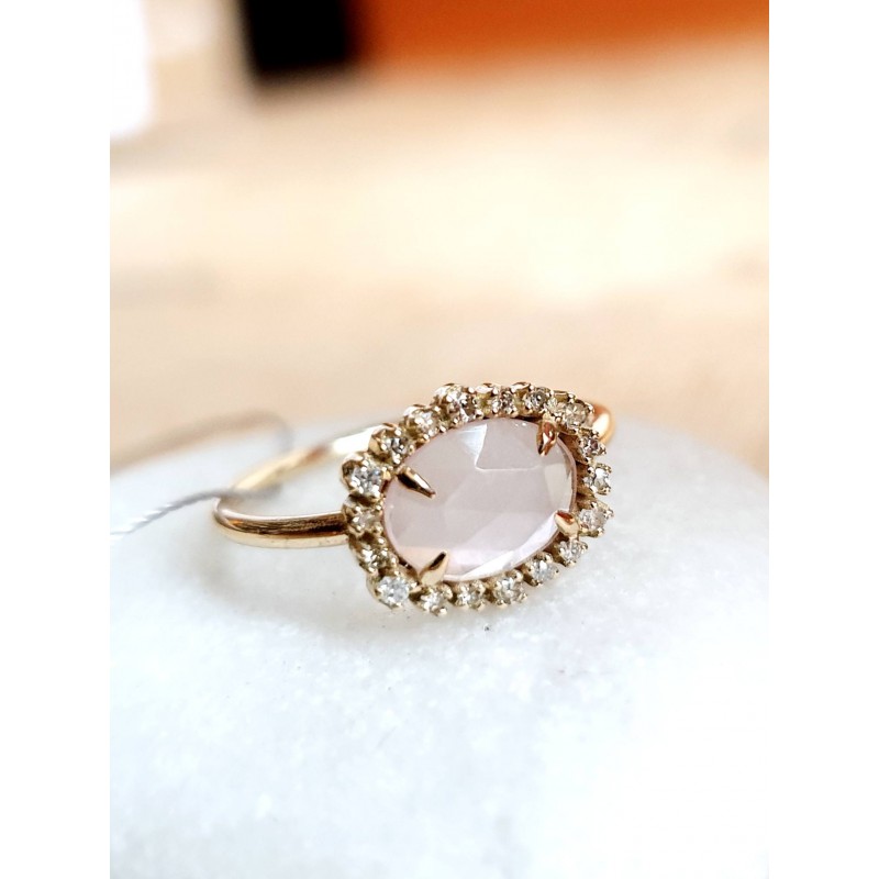 Rankų darbo 14 kartų aukso 585 žiedas su šampano spalvos deimantais 0,09ct ir 1,02ct rožiniu kvarcu, brangakmenio skersmuo cm, svoris 1,63g