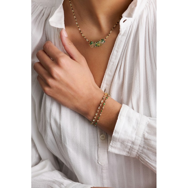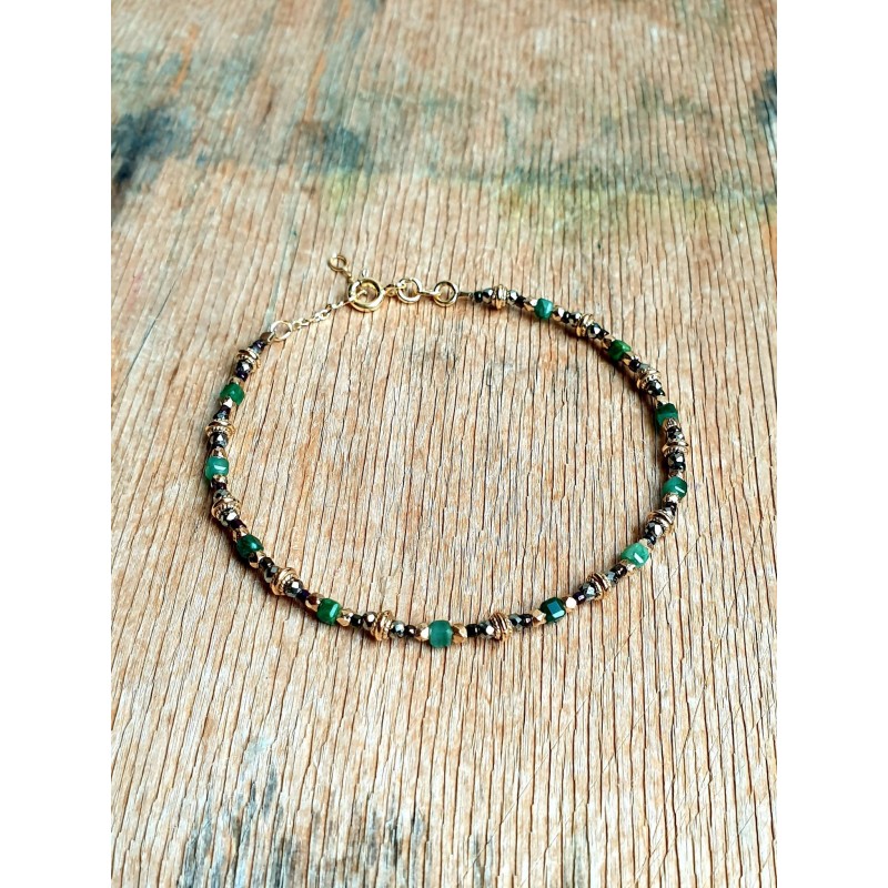 Rankų darbo auksuoto sidabro apyrankė su tamsiai žalio nefrito karoliukais, piritu ir „Matsuno“ karoliukais, sidabras 925 dengtas 24 karatų auksu.