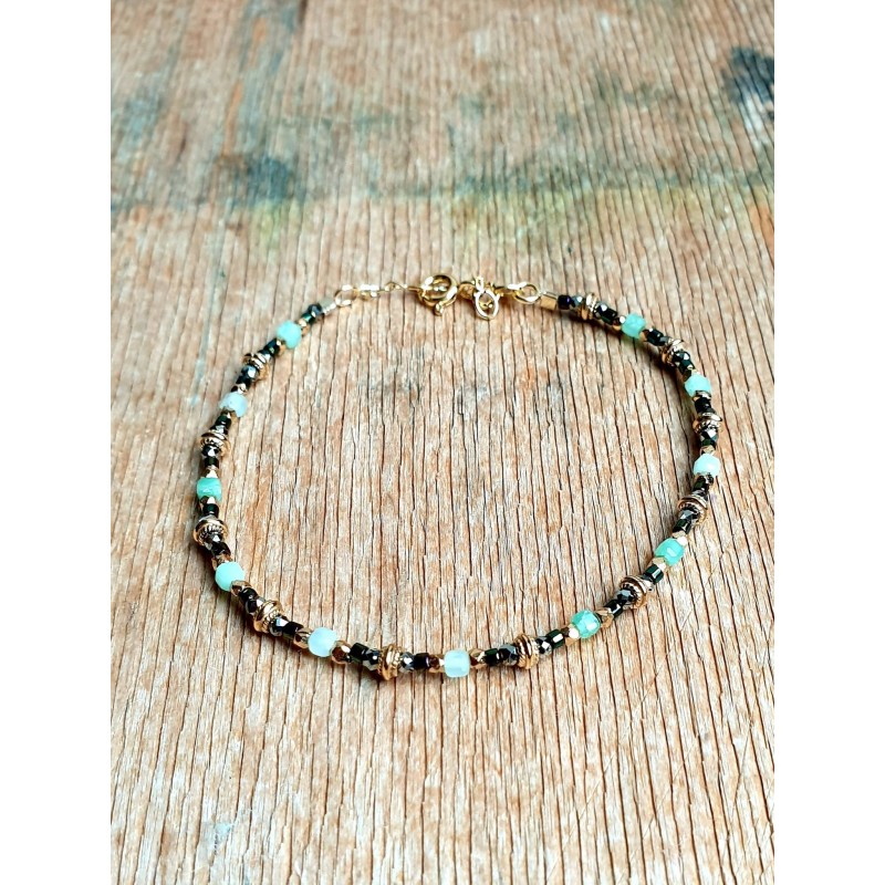 Rankų darbo auksuoto sidabro apyrankė su šviesiai žalio nefrito karoliukais, piritu ir „Matsuno“ karoliukais, sidabras 925 dengtas 24 karatų auksu.