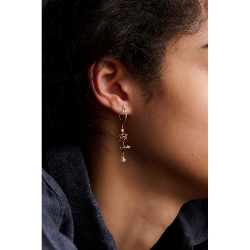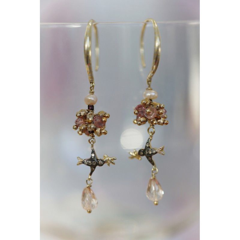 Rankų darbo 24 karatų auksuoto sidabro auskarai su 0,06ct deimantais, gėlavandeniais perlais, granatais ir rožiniais topazais.