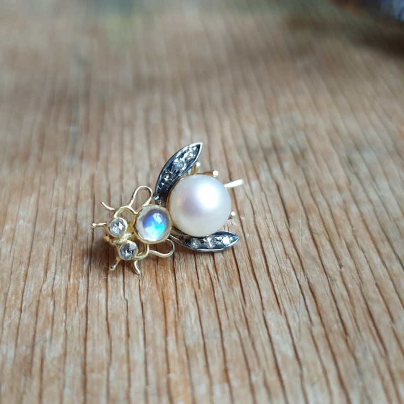5 Octobre auksuoto sidabro sagė su deimantais, perlais ir mėnulio akmeniu
