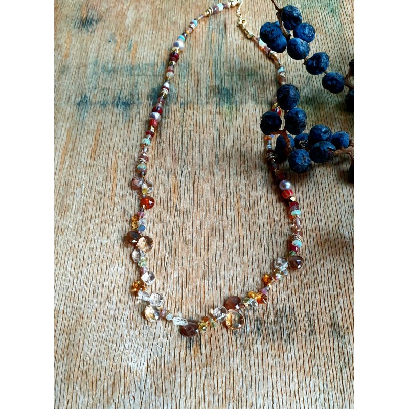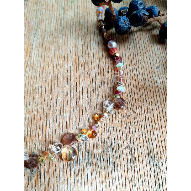 Rankų darbo sidabro kaklo papuošalas su agatais, upiniais perlais, andaluzitu, andesinu, granatu, topazu, ruduoju nefritu, opalu, mėnulio akmeniu, safyru ir turmalinais. Sidabras 925 dengtas 3 mikronomis 24 karatų auksu.