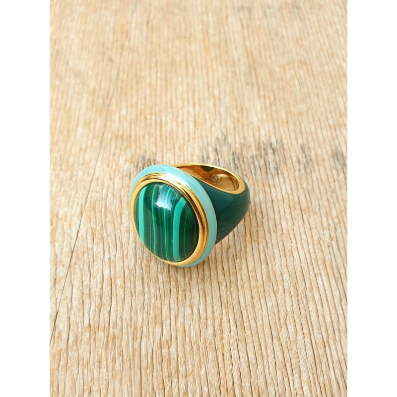 Rankų darbo žiedas su malachitu, žalvaris dengtas 24 karatų auksu.