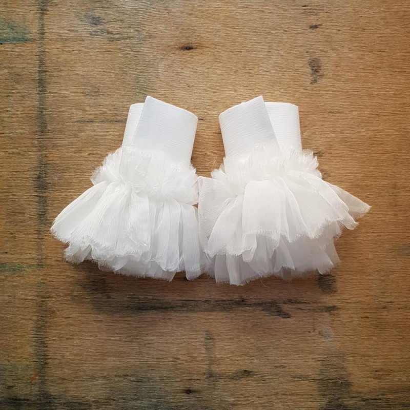 Rankų darbo, šilko šifono rankogaliai, užsegami spaudėmis.