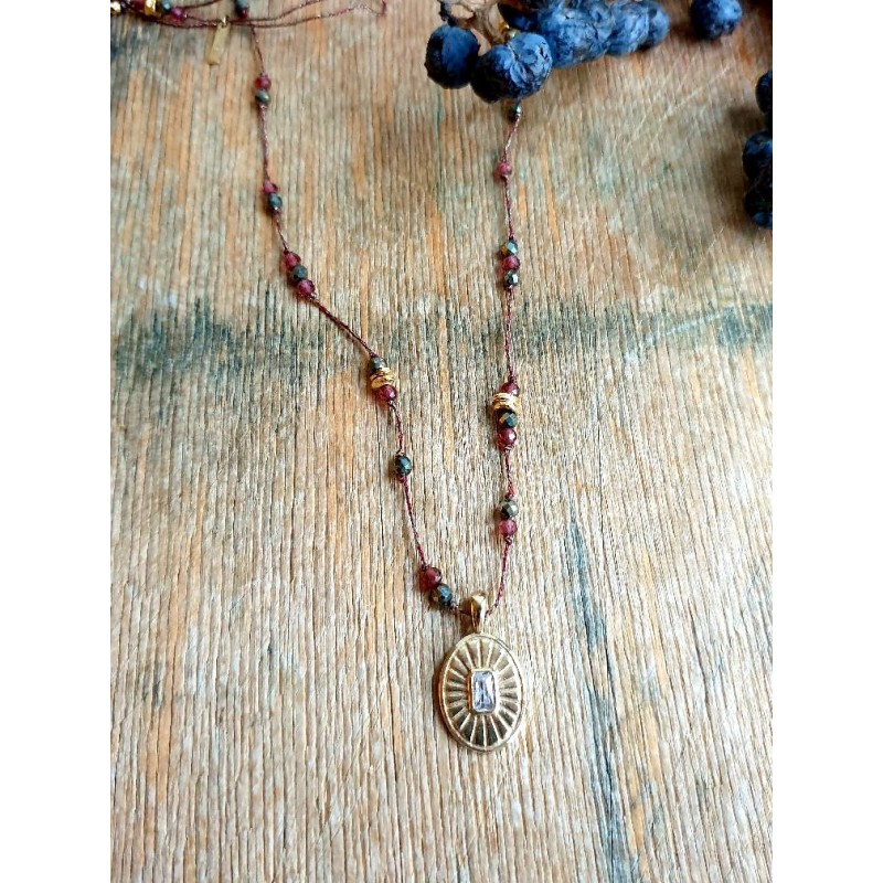 Rankų darbo kaklo papuošalas su piritu ir cirkoniu, žalvaris dengtas 24 karatų auksu.