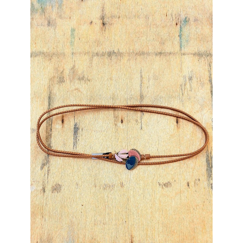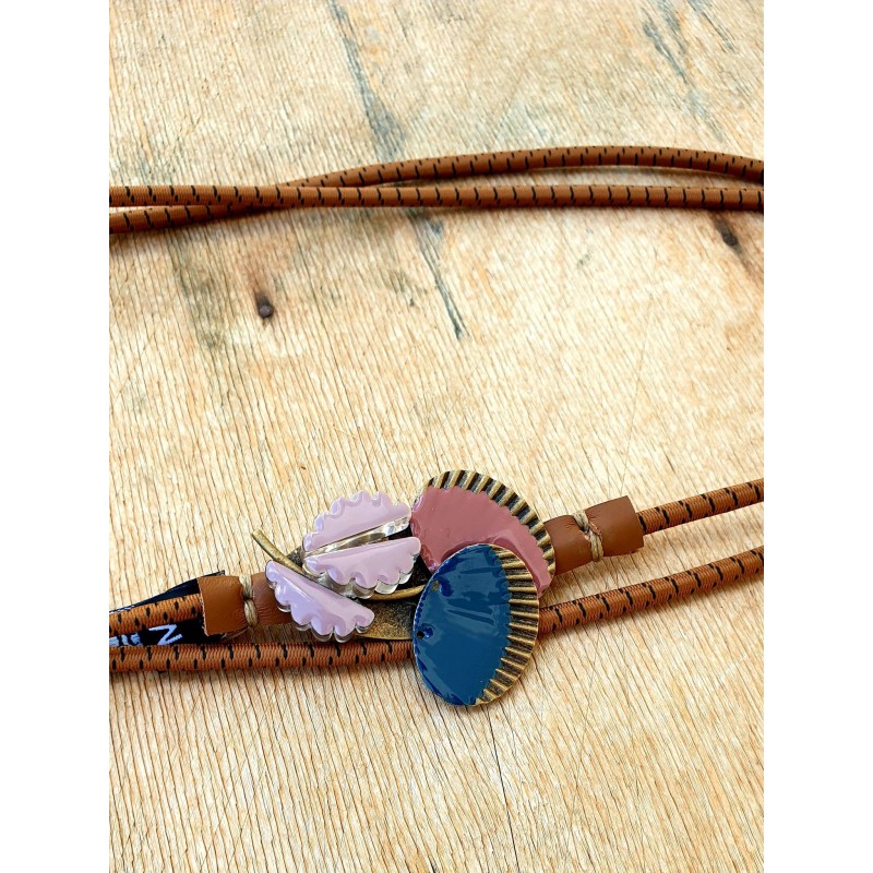 Rankų darbo diržas iš elastinės tekstilės juostos su rankomis tapyta metaline sagtimi.