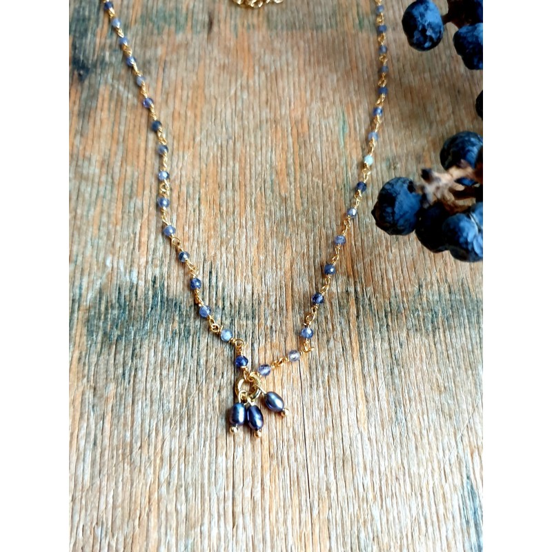 Rankų darbo apyrankė-kaklo papuošalas su jolitu ir perlu, žalvaris dengtas 24 karatų auksu. Apyrankę galima nešioti kaip kaklo papuošalą.