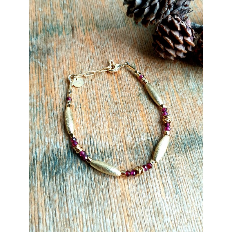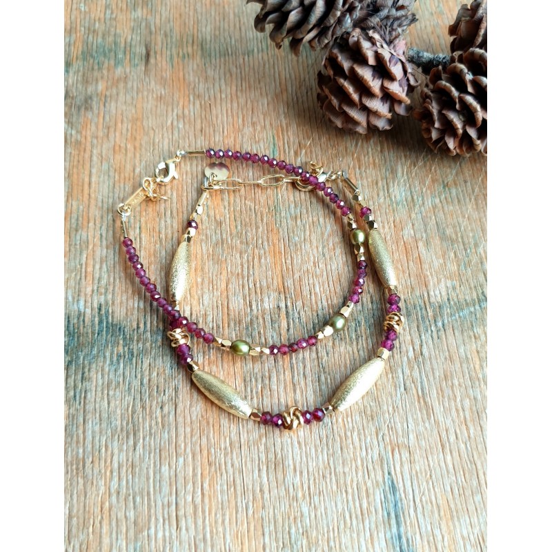 Rankų darbo apyrankė su granatais, žalvaris dengtas 24 karatų auksu ir sidabru.