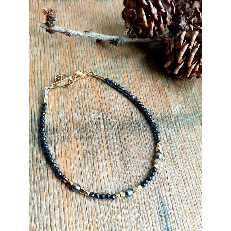 Rankų darbo apyrankė su juoda špinele ir perlais, žalvaris dengtas 24 karatų auksu.