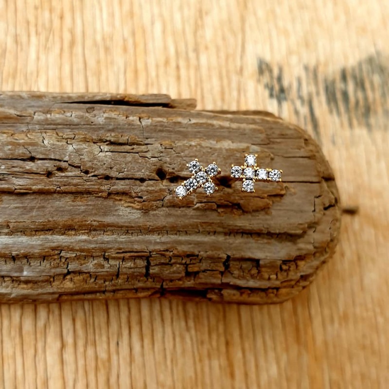 Rankų darbo auskarai su cirkoniu, žalvaris dengtas 24 karatų auksu.