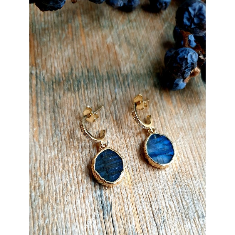 Rankų darbo auskarai su labradoritu, žalvaris dengtas 24 karatų auksu.