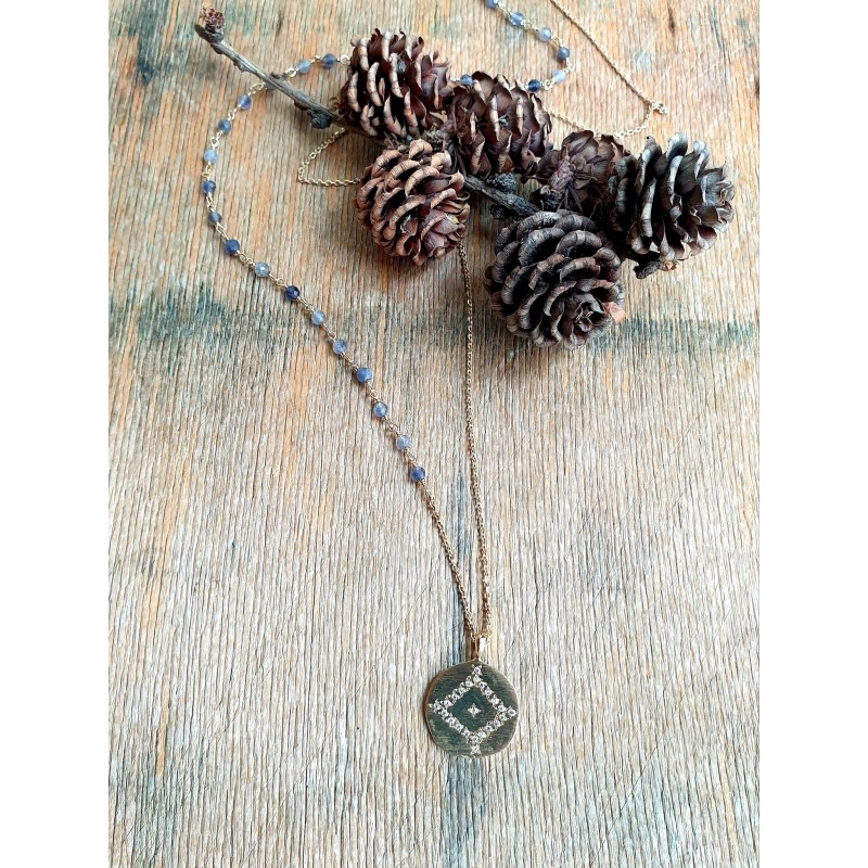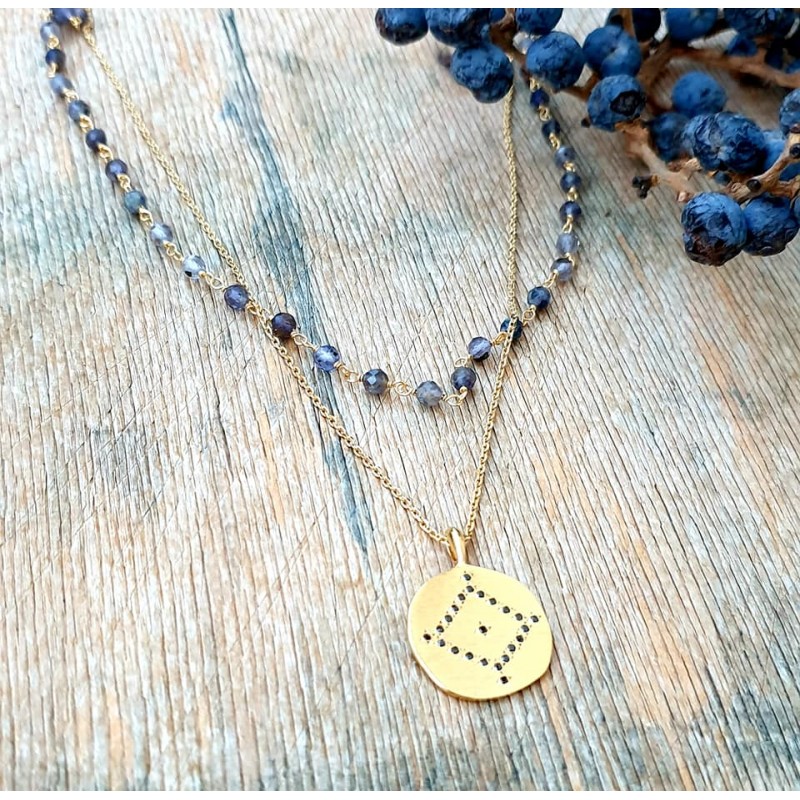 Rankų darbo ilgas kaklo papuošalas su jolitu ir cirkoniu, žalvaris dengtas 24 karatų auksu.