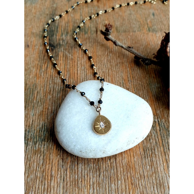 Rankų darbo kaklo papuošalas - apyrankė su špinele ir cirkoniu, žalvaris dengtas 24 karatų auksu. Apyrankę galima nešioti kaip kaklo papuošalą.