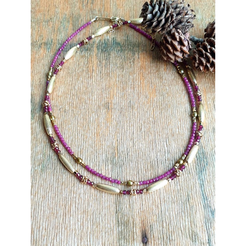 Rankų darbo kaklo papuošalas "Choker" su rubinu, žalvaris dengtas 24 karatų auksu.
