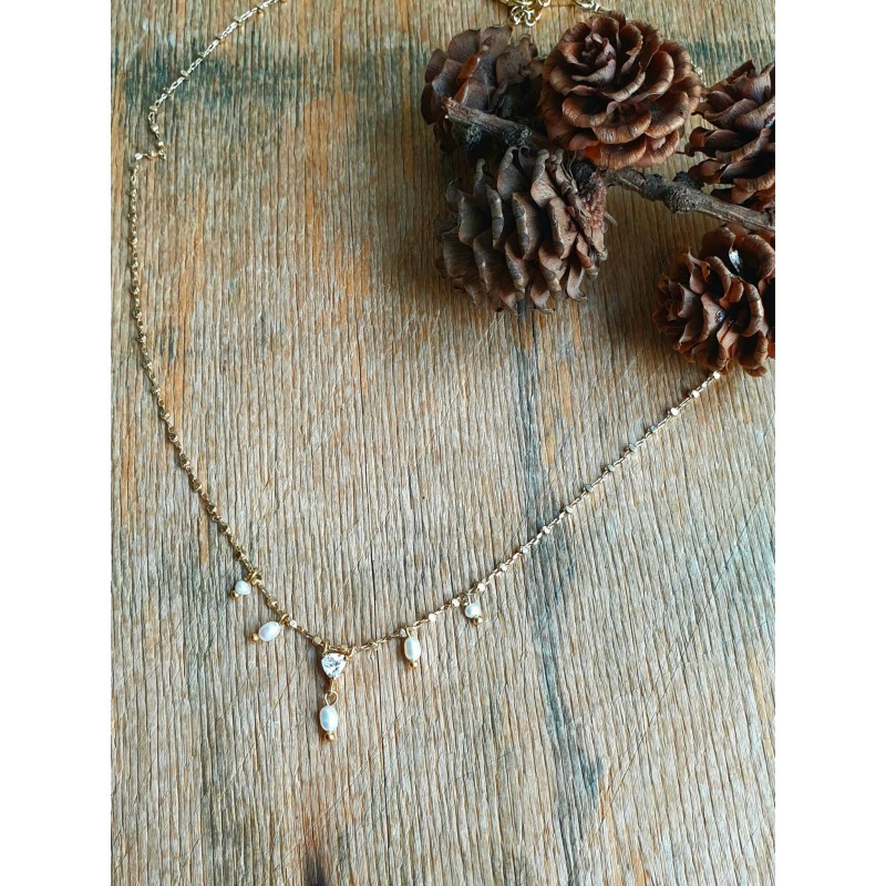 Rankų darbo kaklo papuošalas su perlais, žalvaris dengtas 24 karatų auksu.