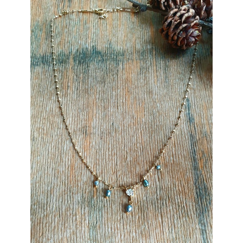 Rankų darbo kaklo papuošalas su perlais, žalvaris dengtas 24 karatų auksu.