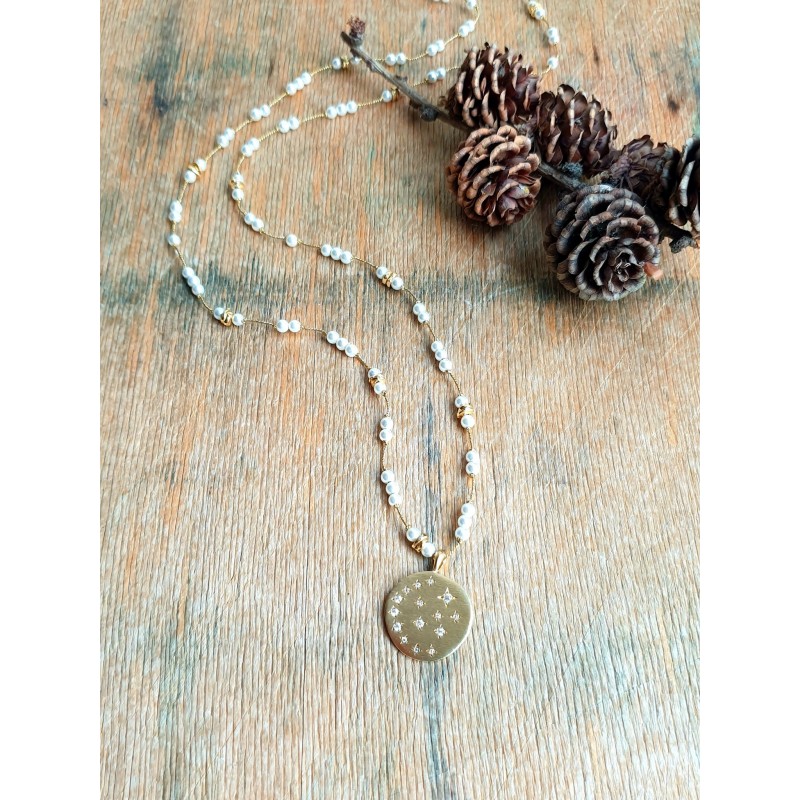 Rankų darbo kaklo papuošalas su perlais ir cirkoniu, žalvaris dengtas 24 karatų auksu.