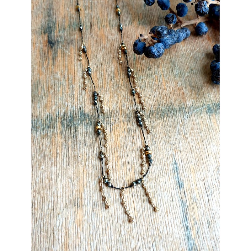 Rankų darbo kaklo papuošalas su piritu, žalvaris dengtas 24 karatų auksu.
