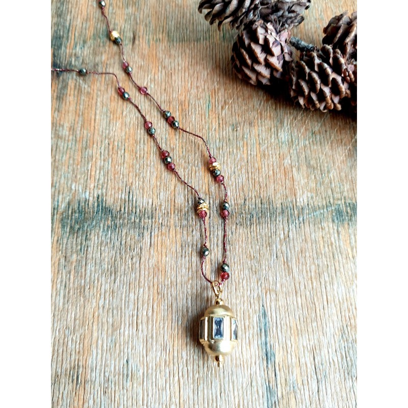 Rankų darbo kaklo papuošalas su piritu, granatu ir cirkoniu, žalvaris dengtas 24 karatų auksu.
