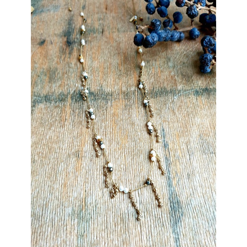 Rankų darbo kaklo papuošalas su piritu ir perlu, žalvaris dengtas 24 karatų auksu.