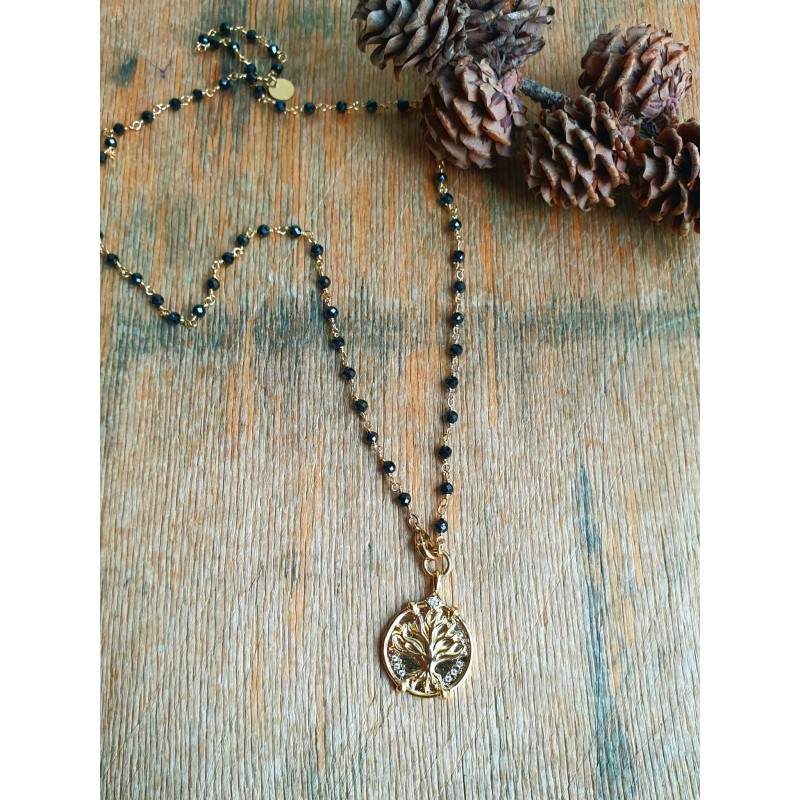 Rankų darbo kaklo papuošalas su špinele ir cirkonio medalionu, žalvaris dengtas 24 karatų auksu.