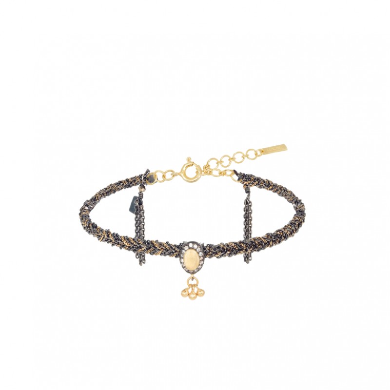 Rankų darbo apyrankė pagaminta iš sidabro, įpintas šilko siūlas, puošta deimantų plokštelėmis ir auksuotomis detalėmis. Sidabras 925.