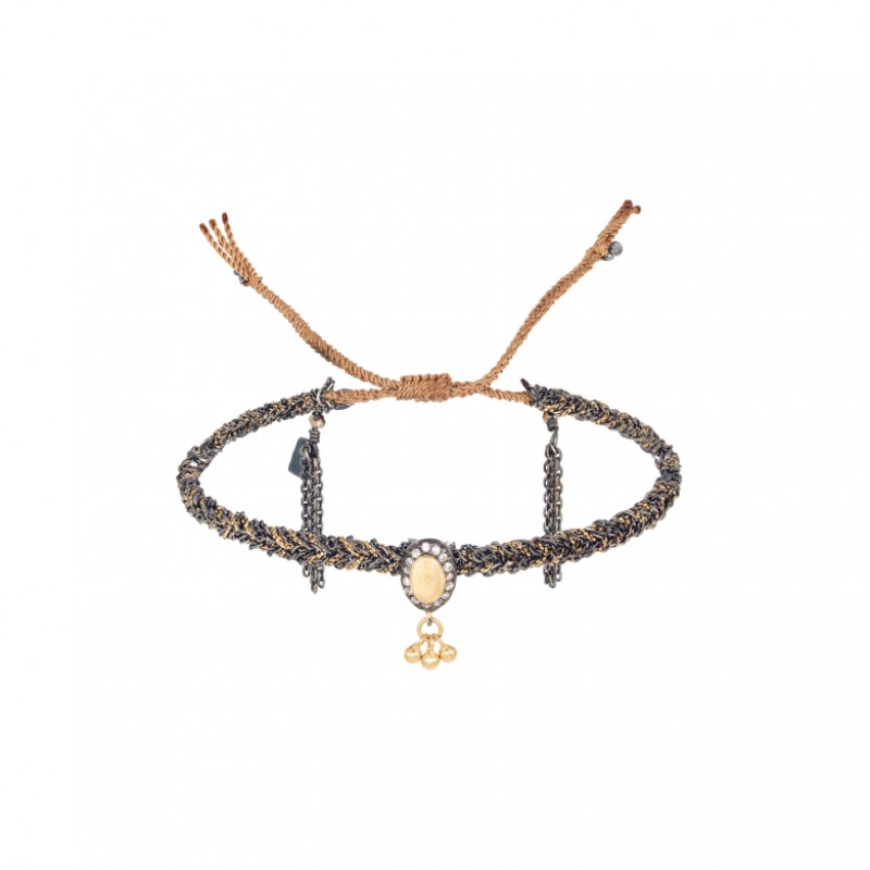 Rankų darbo apyrankė pagaminta iš sidabro, įpintas šilko siūlas, puošta deimantų plokštelėmis ir auksuotomis detalėmis.. Šilko siūlų raištelių pagalba apyrankė didinasi ir mažinasi. Sidabras 925.