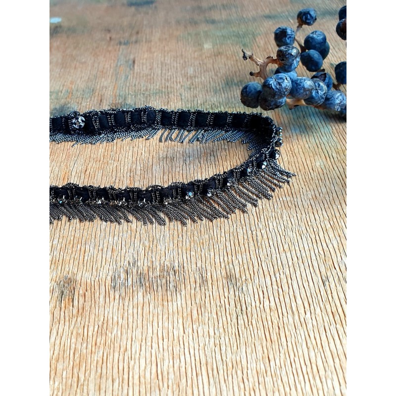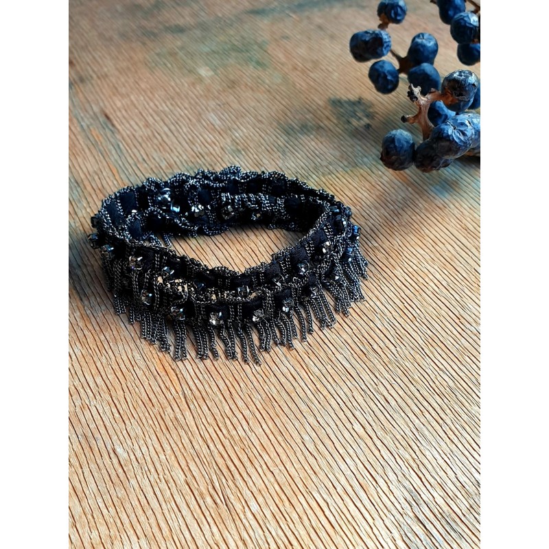 Rankų darbo apyrankė-kaklo papuošalas pagaminta iš siuvinėto grandinėlėmis ir karoliukais poliamido, su reguliuojamu užsegimu su spaudėmis. Svoris: 18g Ilgis: 33cm