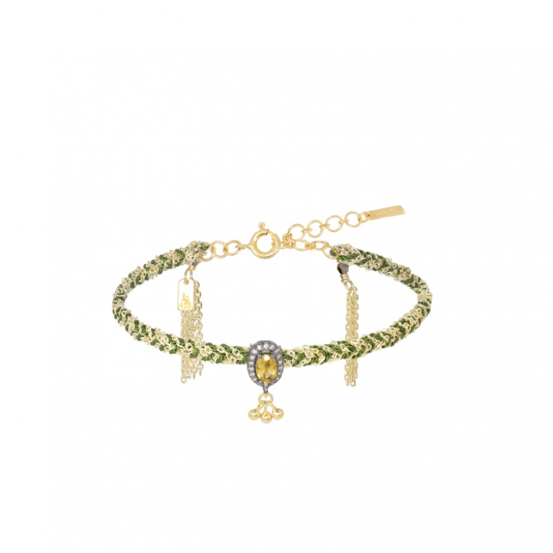 Rankų darbo apyrankė pagaminta iš sidabro, supinta su juodais siūlais ir puošta turmalinu ir deimantais. Šilko siūlų raištelių pagalba apyrankė didinasi ir mažinasi. Sidabras 925.