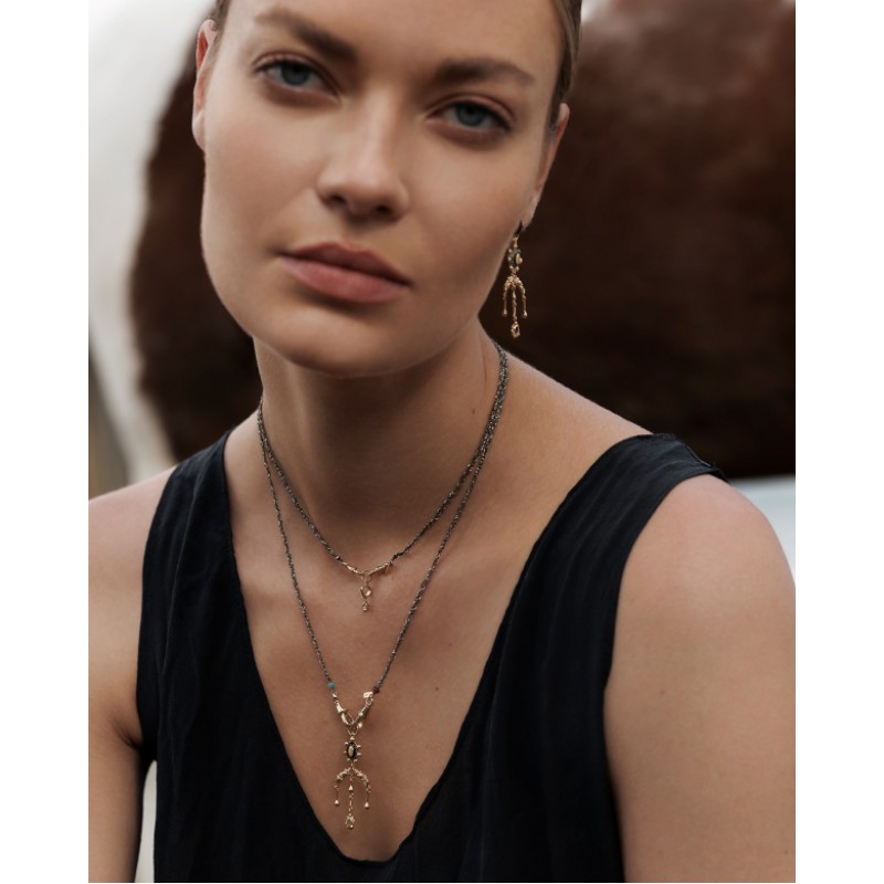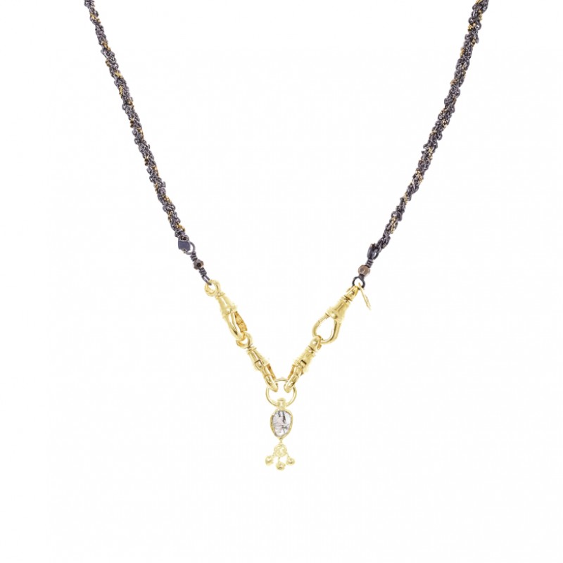 Rankų darbo auksuoto sidabro kaklo papuošalas su deimanto plokštele, supintas iš sidabro grandinėlių su šilko siūlu, puoštas dekoro detalėmis. Užsegimas reguliuojasi, sidabras 925.