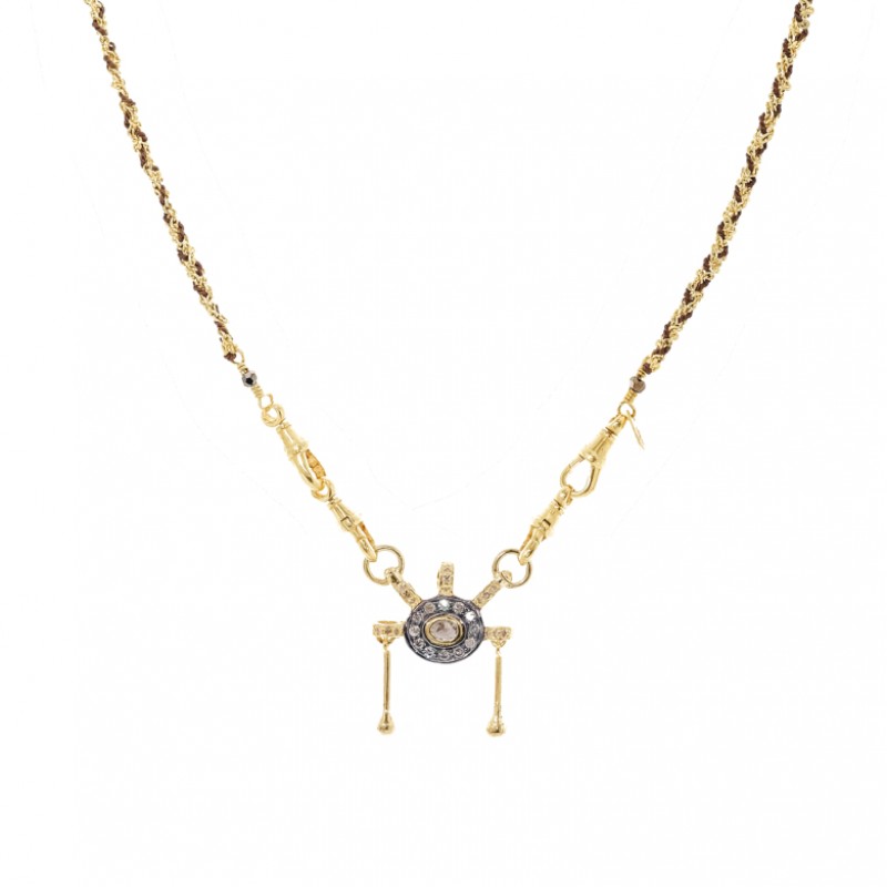 Rankų darbo auksuoto sidabro kaklo papuošalas su deimanto plokštele, supintas iš sidabro grandinėlių su šilko siūlu, puoštas dekoro detalėmis. Užsegimas reguliuojasi, sidabras 925.