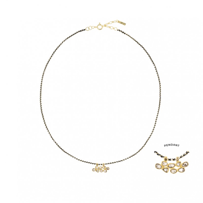 Rankų darbo auksuoto sidabro kaklo papuošalas su deimanto plokštele, supintas iš sidabro grandinėlių su šilko siūlu, puoštas dekoro detalėmis. Užsegimas reguliuojasi, sidabras 925.