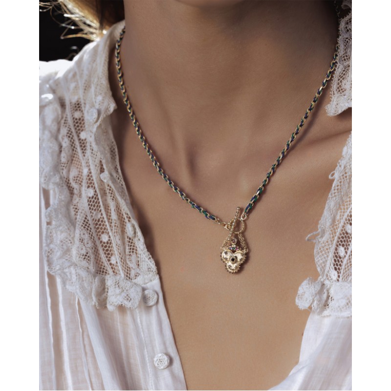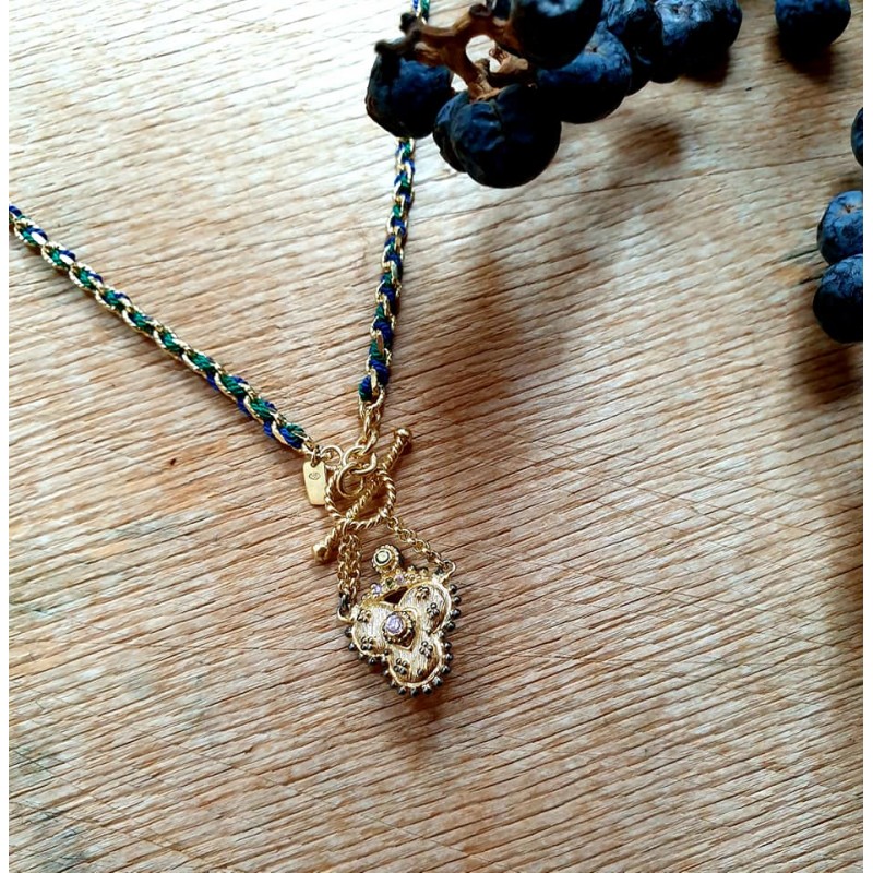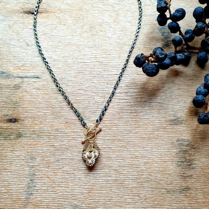 Rankų darbo auksuoto sidabro kaklo papuošalas su deimanto plokštele, supintas iš sidabro grandinėlių, įvertas šilko siūlas. Užsegimas su auksuoto sidabro žiedu, sidabras 925.