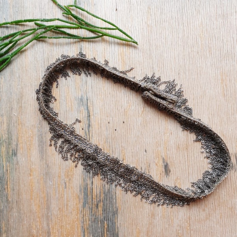 Rankų darbo apyrankė - kaklo papuošalas, pagaminta iš bronzos, supinta su liurekso siūlais ir puošta kabačiomis grandinėlėmis. Spaudžių pagalba apyrankė didinasi ir mažinasi.