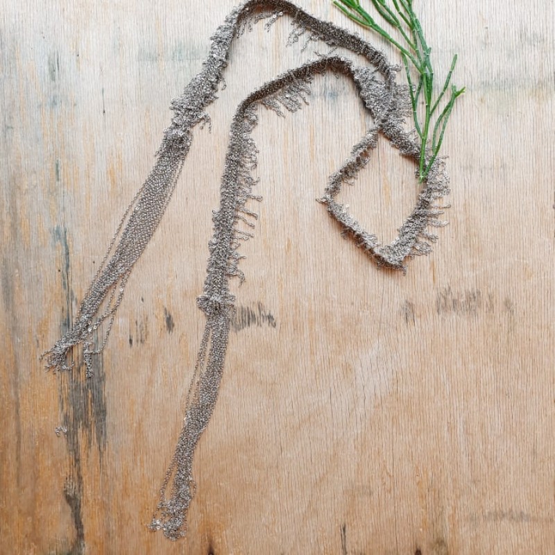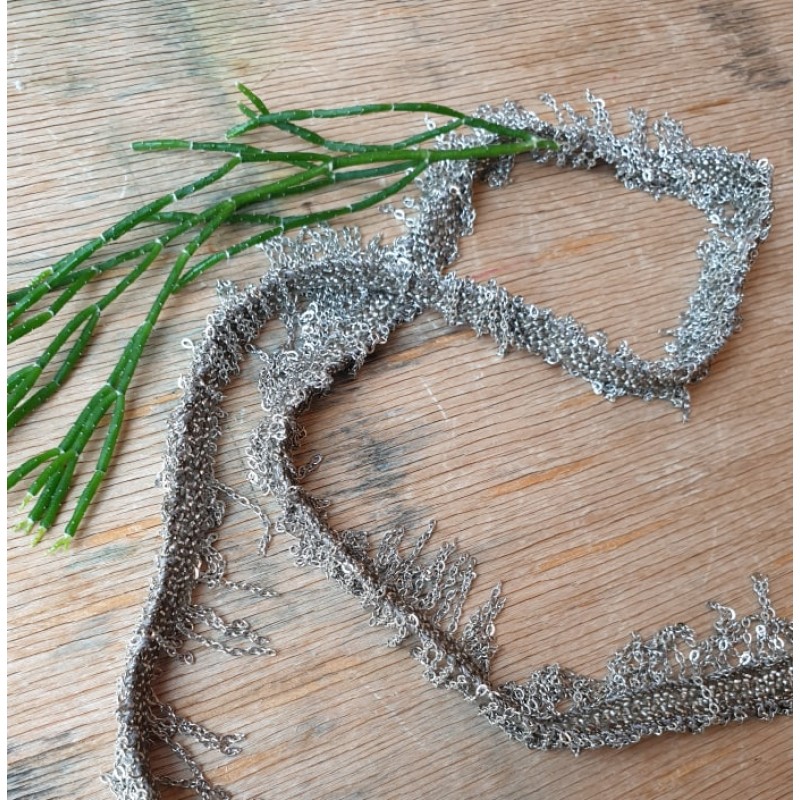 Rankų darbo ilgas kaklo papuošalas iš bronzos, galuose puoštas grandinėlėmis.