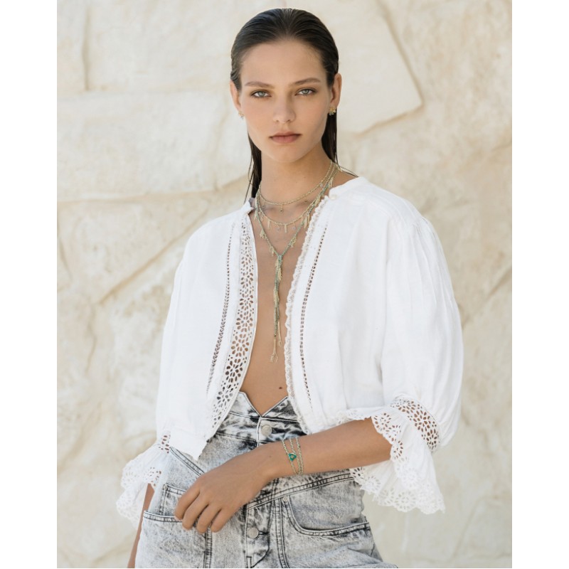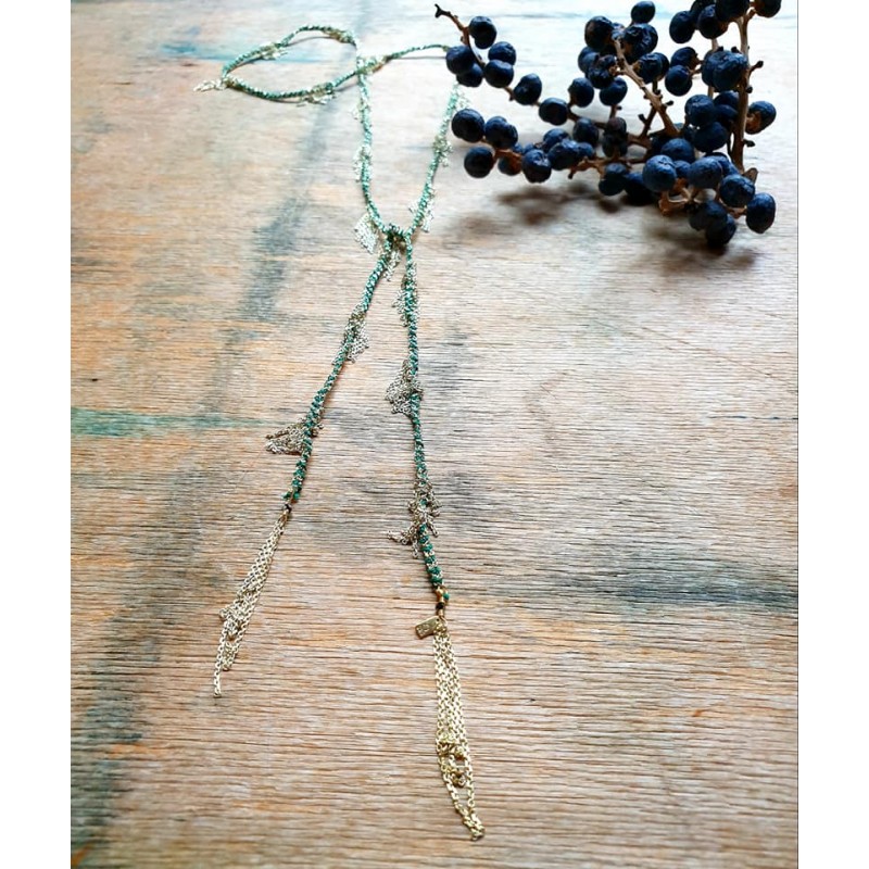 Rankų darbo ilgas kaklo papuošalas pagamintas iš 18 karatų auksuoto 925 sidabro, puoštas auksuotom grandinėlių detalėm. Ant kaklo rišamas skirtingais ilgiais. Sidabras 925.