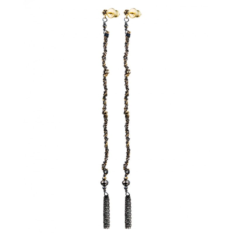 Rankų darbo ilgi sidabo auskarai, puošti rodžiuoto sidabro grandinėlėmis ir cirkonio karoliukais. Sidabras 925.