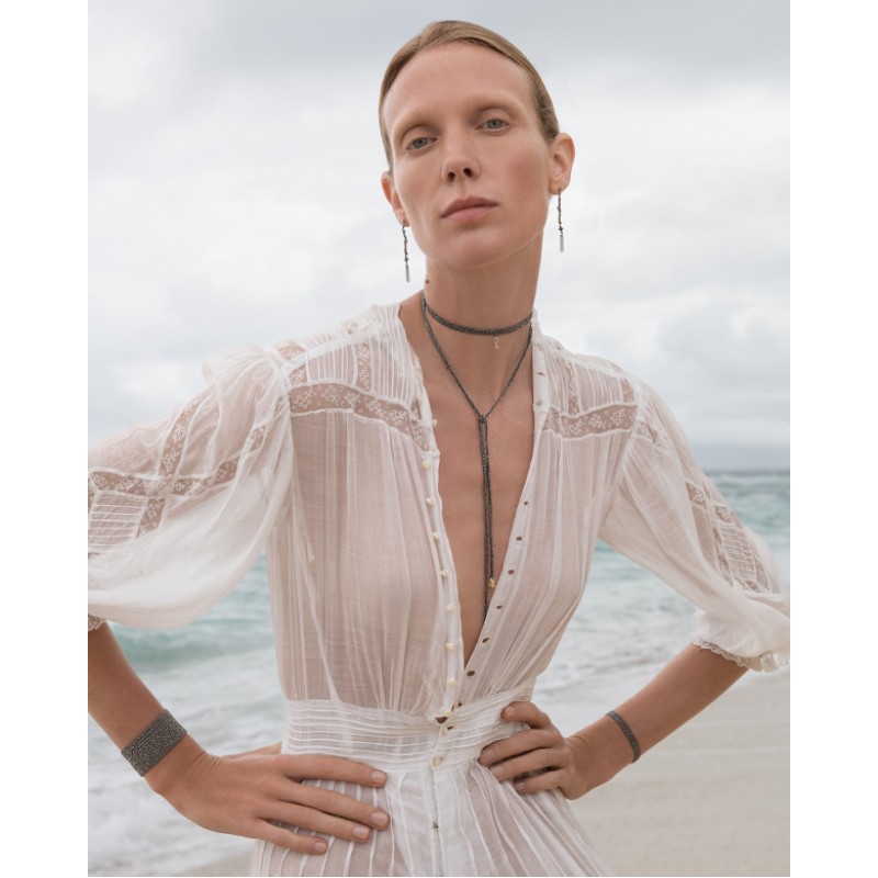 Rankų darbo ilgi sidabo auskarai, puošti sidabro grandinėlėmis ir cirkonio karoliukais. Sidabras 925.