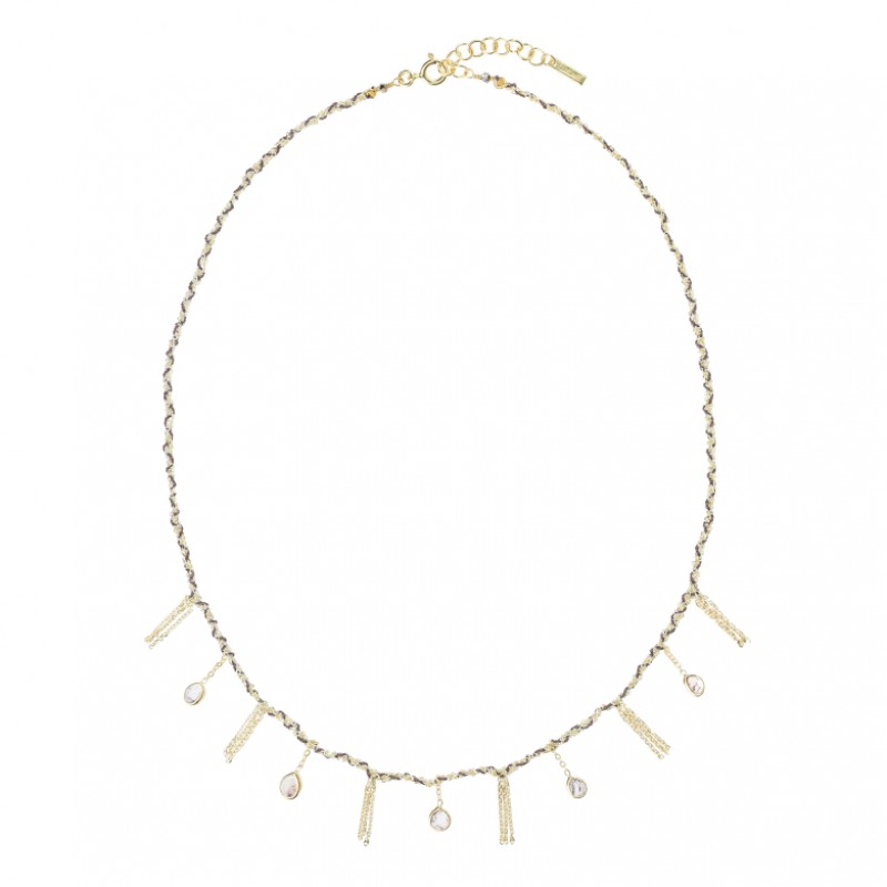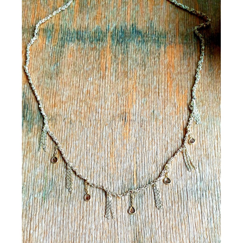 Rankų darbo sidabrinis kaklo papuošalas su deimantų plokštelėmis, supintas iš sidabro siūlo grandinėlių, galuose puoštas grandinėlių iš sidabro detalėmis. Sidabras 925