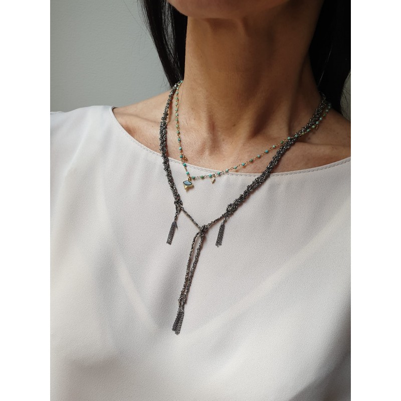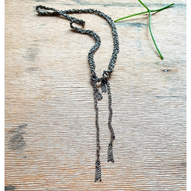 Rankų darbo sidabrinis kaklo papuošalas supintas iš sidabro grandinėlių, įaustu šilko siūlu ir galuose puoštas stiklo karoliukais. Ant kaklo rišamas skirtingais ilgiais, taip pat vyniojamas ant rankos.Sidabras 925.