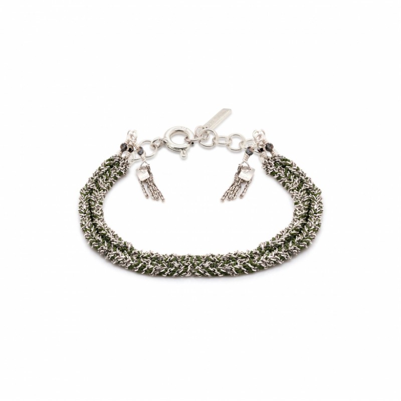 Rankų darbo apyrankė pagaminta iš sidabro, supinta su šilko siūlu. Sidabro žiedų užsegimo pagalba apyrankė didinasi ir mažinasi. Sidabras 925
