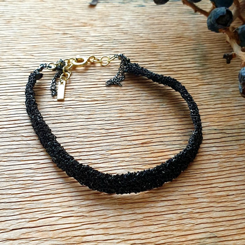 Rankų darbo sidabro apyrankė pagaminta iš sidabro, supinta su šilko siūlais ir puošta krištolo karoliukais. Sidabro žiedų užsegimo pagalba apyrankė didinasi ir mažinasi. Sidabras 925