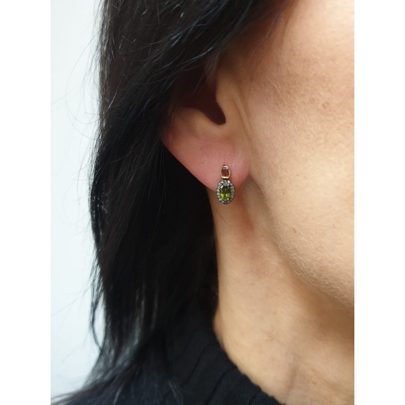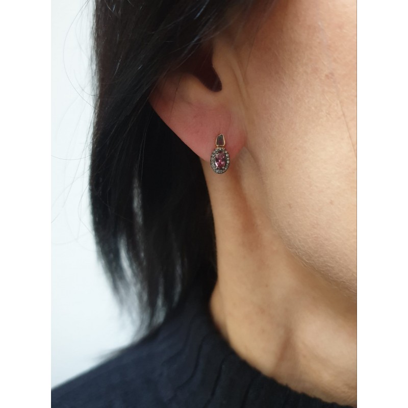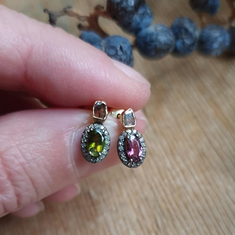 Rankų darbo sidabro auskarai, dengti 18 karatų auksu ir rodžiu, puošti 0,06ct deimantais ir turmalinais. Sidabras 925.