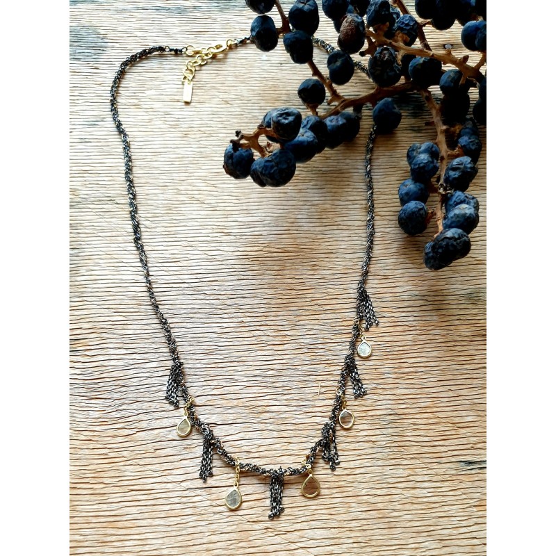 Rankų darbo kaklo papuošalas pagamintas iš auksuoto sidabro, puoštas grandinėlių dekoru, įpintas auksuotas siūlas, deimantų plokštelės. Sidabras 925.
