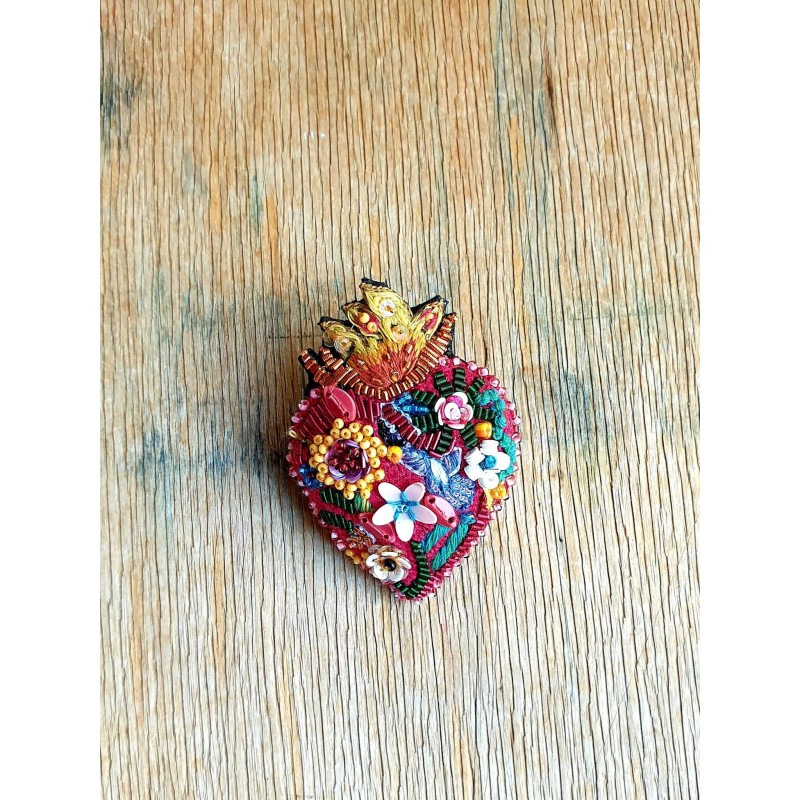 Rankų darbo siūlais ir karoliukais siuvinėta sagė.