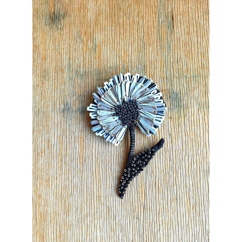 Rankų darbo siūlais ir karoliukais siuvinėta sagė.