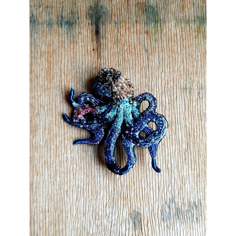 Rankų darbo siūlais ir karoliukais siuvinėta sagė.