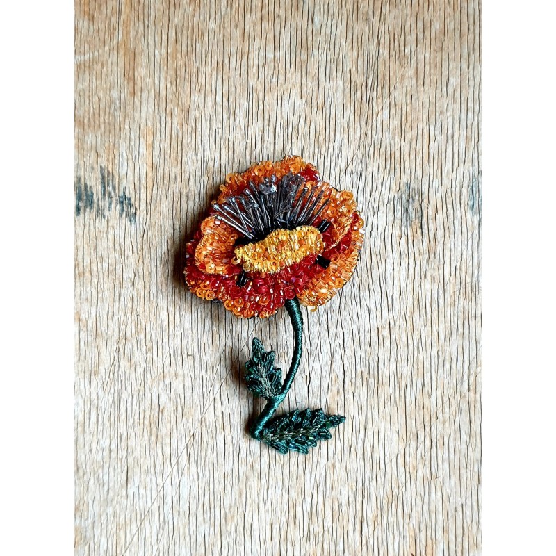 Rankų darbo siūlais ir karoliukais siuvinėta sagė.