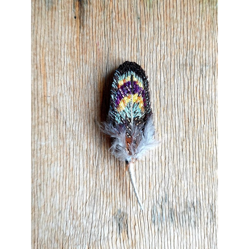 Rankų darbo siūlais ir karoliukais siuvinėta sagė.